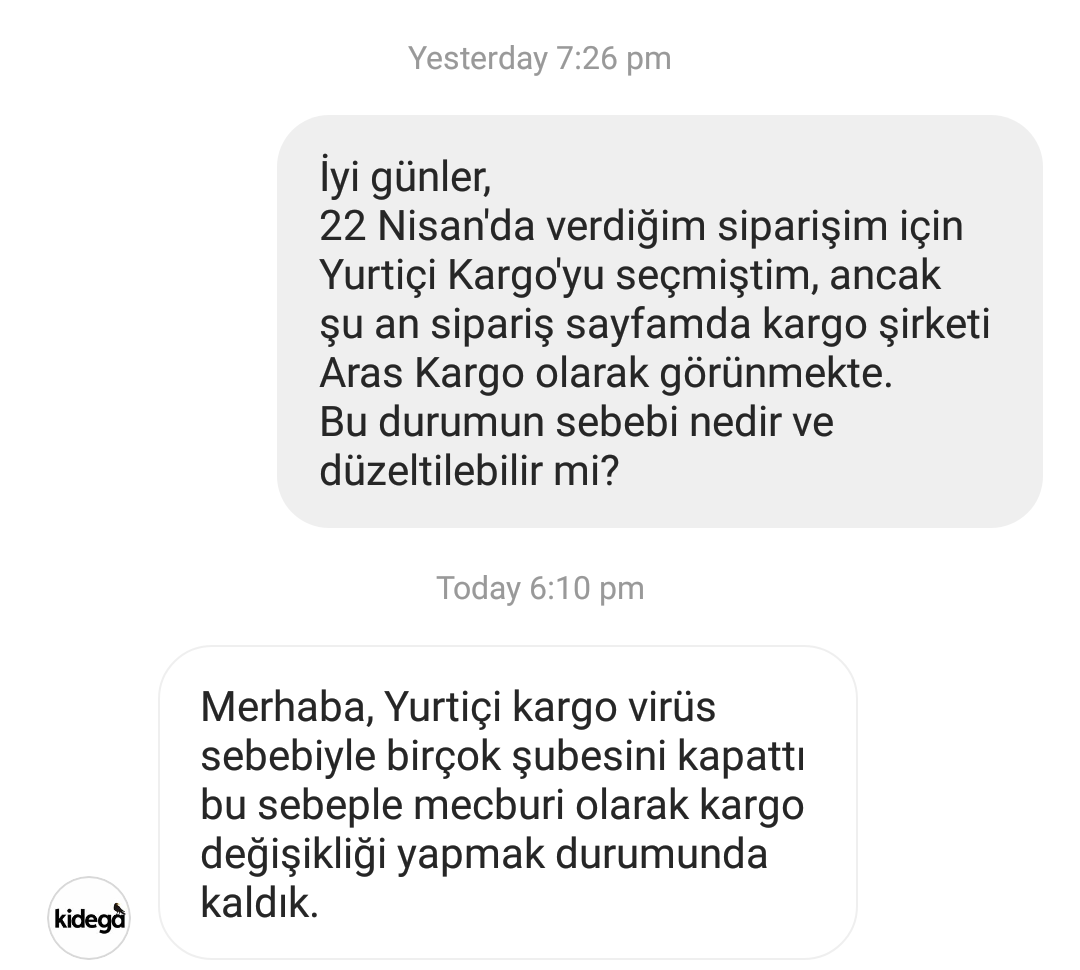 Dikkatimi yeni çekti, ben Yurtiçi Kargo’yu seçmiştim, ama sipariş sayfamda Aras olarak görünüyor, Kidega ile iletişime geçmem halinde düzeltilebilir mi? Sanırım Aras Kargo’ dan şikayetçiydi birçok üye.