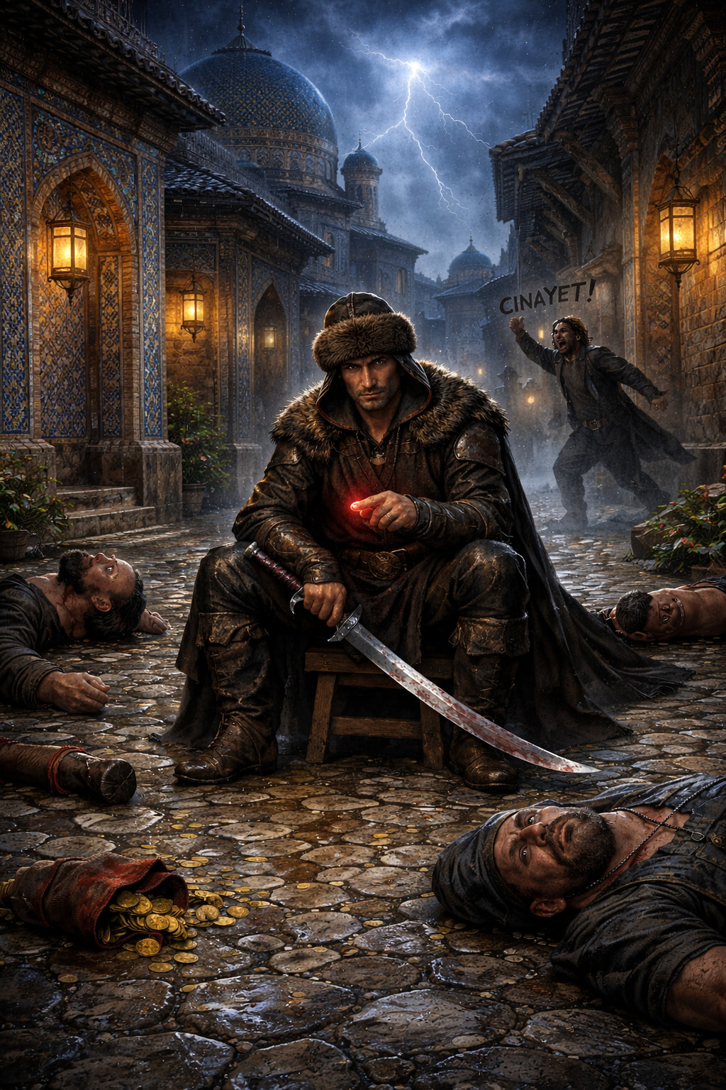 Karanlık, rutubetli bir ara sokaktaydılar. Yağmur iri tanelerle yağıyor, gök gürüldüyordu. Damlalar, gezginin yün ve deri börkünden aşağı süzülüp ipek pelerininin omuzlarına akıyordu. Gezgin istifini bozmadı; sağ elini şalvarını saran kemerine götürdü, bir kese çıkarıp palabıyıklının önüne fırlattı.