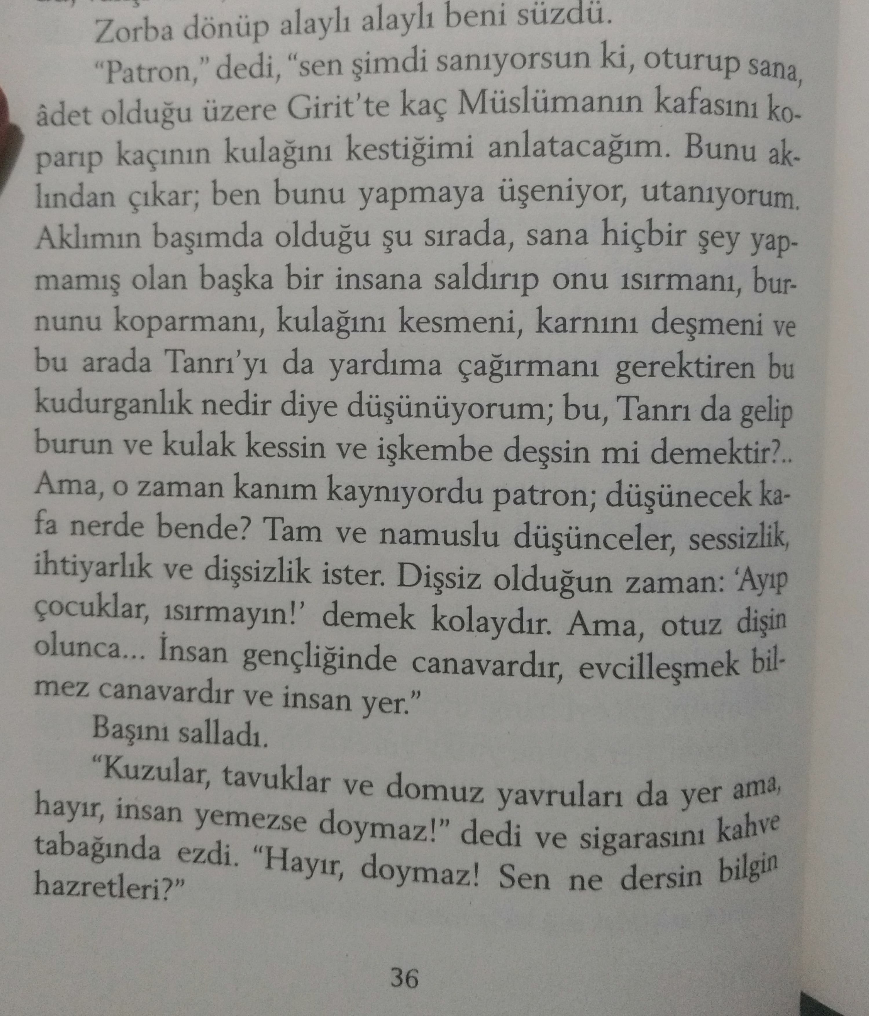 “İnsan canavardır!” diye bağırdı ve sopasını şiddetle taşlara vurdu. “Büyük canavar! Zatın bunu bilmiyor. Bütün işlerin yolunda gitmiş, ama bir de bana sor. Canavar, diyorum sana! Ona kötülük mü ettin? Senden çekinir ve titrer. İyilik mi yaptın? Gözlerini oyar… Aradaki uzaklığı koru patron! İnsanlara umut verme. Hepimizin eşit olduğumuzu, hepimizin eşit haklara sahip bulunduğumuzu söyleme; çünkü hemen senin hakkını çiğner, elinden ekmeğini kapar, açlıktan gebermeye bırakırlar seni.”