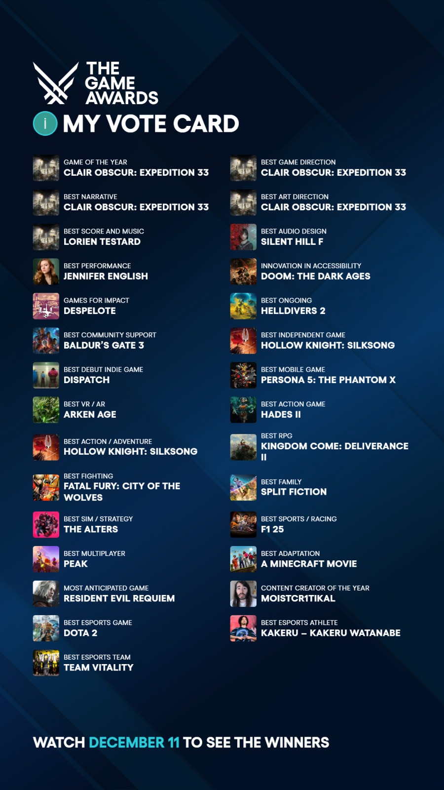 The Game Awards 2025 için oyumuzu verdik çok şükür, memlekete hayırlı uğurlu olsun ve lütfen 2026 yılı bu kadar iyi oyunun çıktığı bir sene olmasın. Bu sene okuduğum kitap sayısı geçen seneye göre yarı yarıya azalmış bu yüzden, bakın bu bir dramdır.