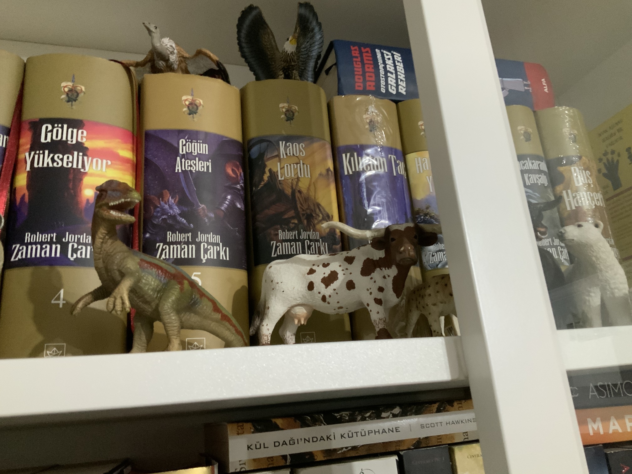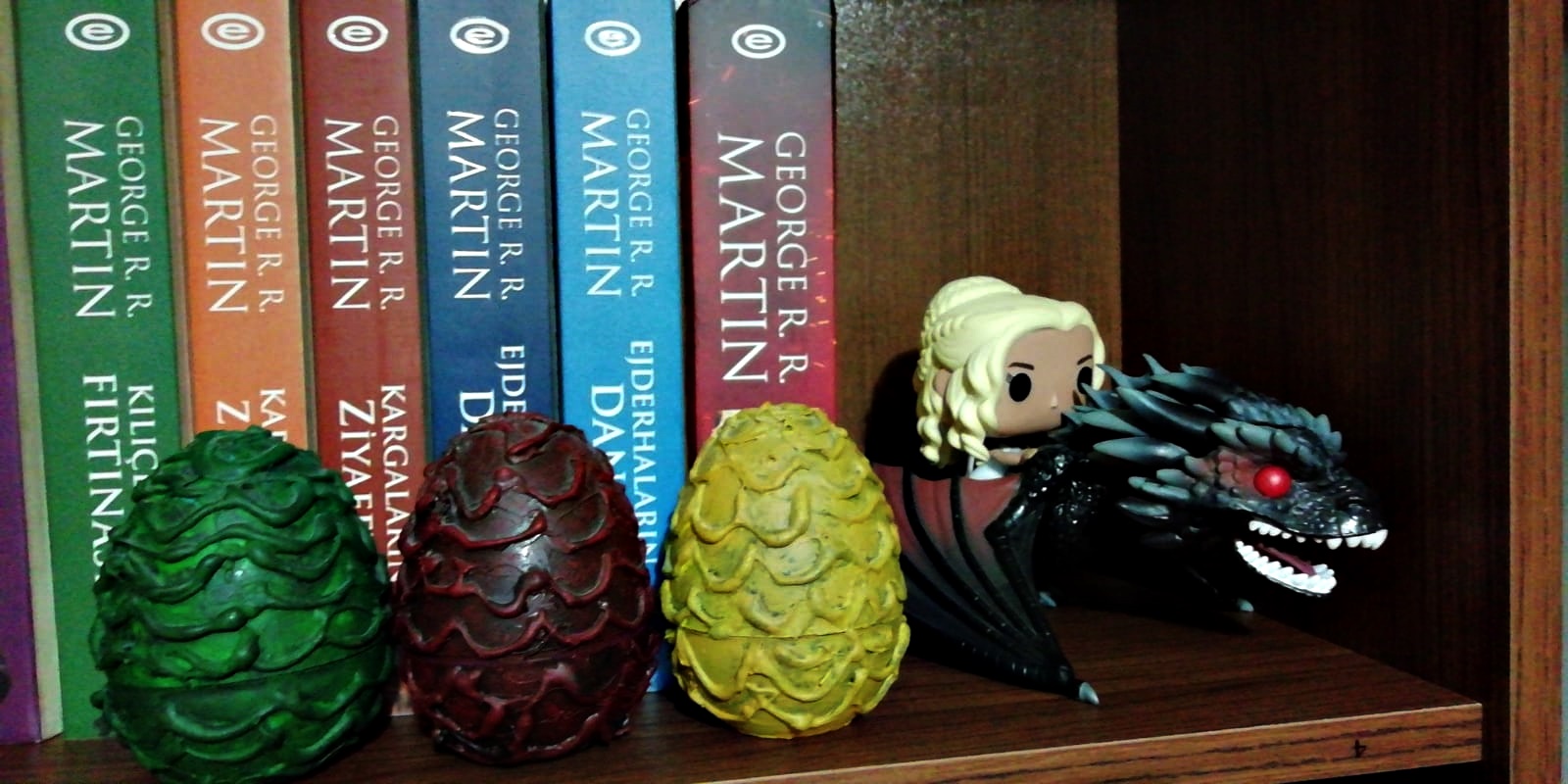 Bir de Buz ve Ateşin Şarkısı kitaplarımın olduğu rafta arkadaşlarımın hediye ettiği Daenerys ile Drogon figürü var. Yumurtaları da ben kendim yapmıştım birkaç yıl önce