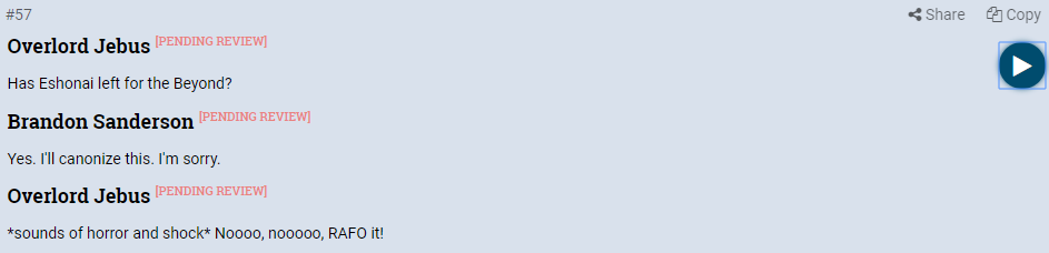 Evet üzücü bir haber, soruyu soran kişinin de tepkisini dinlemek isterseniz deyip link verecektim ama Oathbringer spoilers varmış o yüzden kesip resmini koyayım: