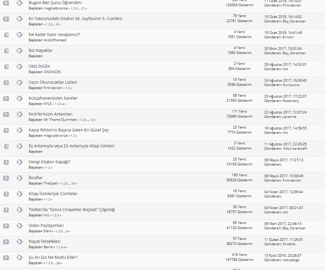 2 senedir foruma tek bir cümle katkınız yok, gelip forumun seviyesi düşük derseniz hadi ordan deriz biz de. Kusura bakmayın ama önce bir katkı sağlayın. Edebiyat tartışılsın seviye yükselsin demeden önce bir ucundan tutun bakalım bir görelim edebiyat nasıl tartışılıyormuş. Biz beceremiyoruz madem “sizin seviyenize çıkamıyoruz” gelin bizim seviyemize inip bir örnekler topluluğu oluşturun.