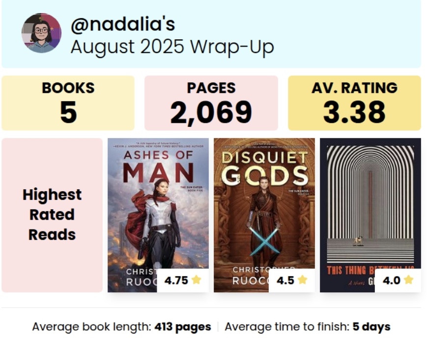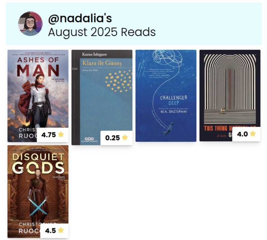 Bu ay gerçekten kendimi aştım. Gregor serisi bana çocuksu geldiği icin diğer 4 kitabı aşırı hızlı sadece bakmak için okudum. O yüzden buraya eklemedim. Polisiye kitaplarını da tavsiye ediyorum.