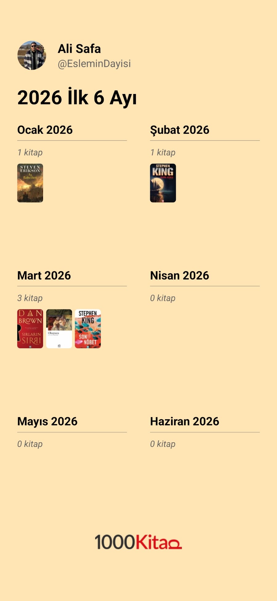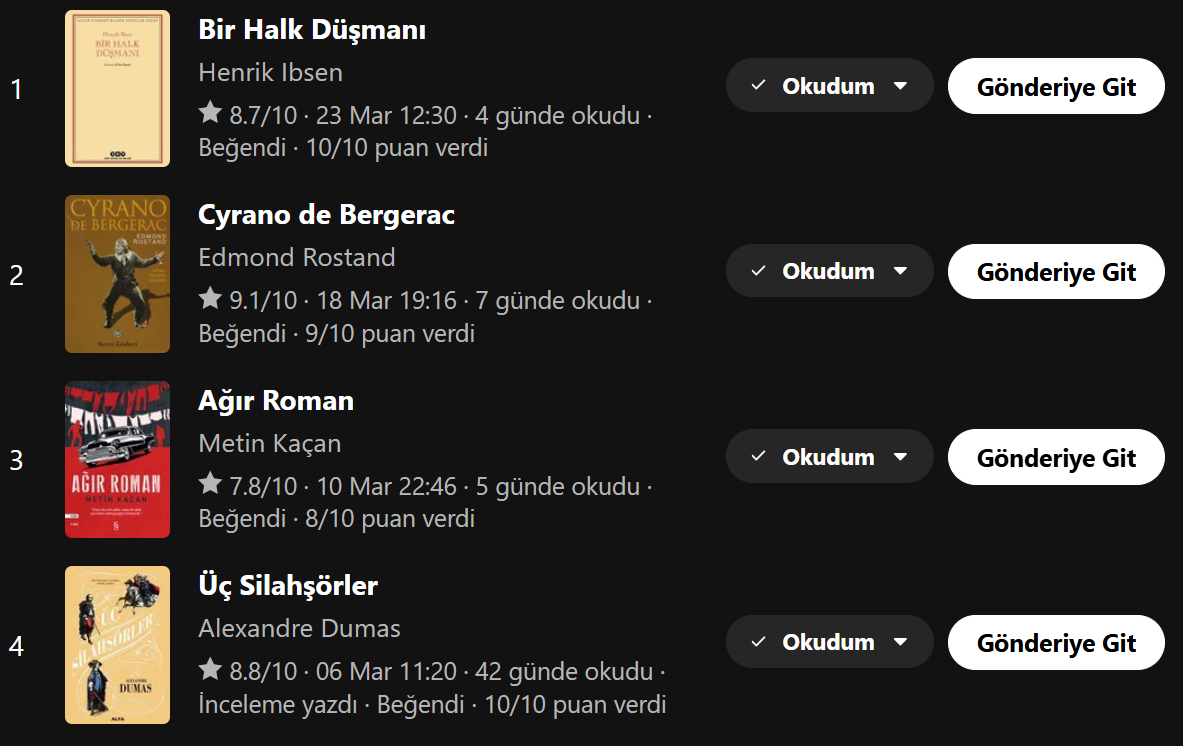 Dip not: Bu konuda aylık okumalarınız moralimi bozuyor. Çok okuyor herkes arkadaş. Bu kadar vaktim yok. Gençliğimde bu ortalamanın çok üzerinde okuduğum zamanlar oldu ama şimdi maksimum bir ayda 2bin sayfa anca çeviririm o da üst limit yani. Yemeden içmeden kesilip okumam lazım. ![]()