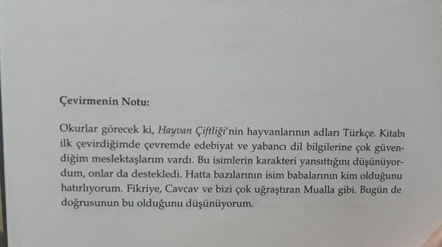 Hayvan Çiftliği’ni Sevin Okyay çevirisinden okumayı düşünen arkadaşlar için söylüyorum.Sevin Okyay hayvanlara Türkçe isimler vermiş, “Fikriye”, “Mualla” gibi. Haberiniz olsun.