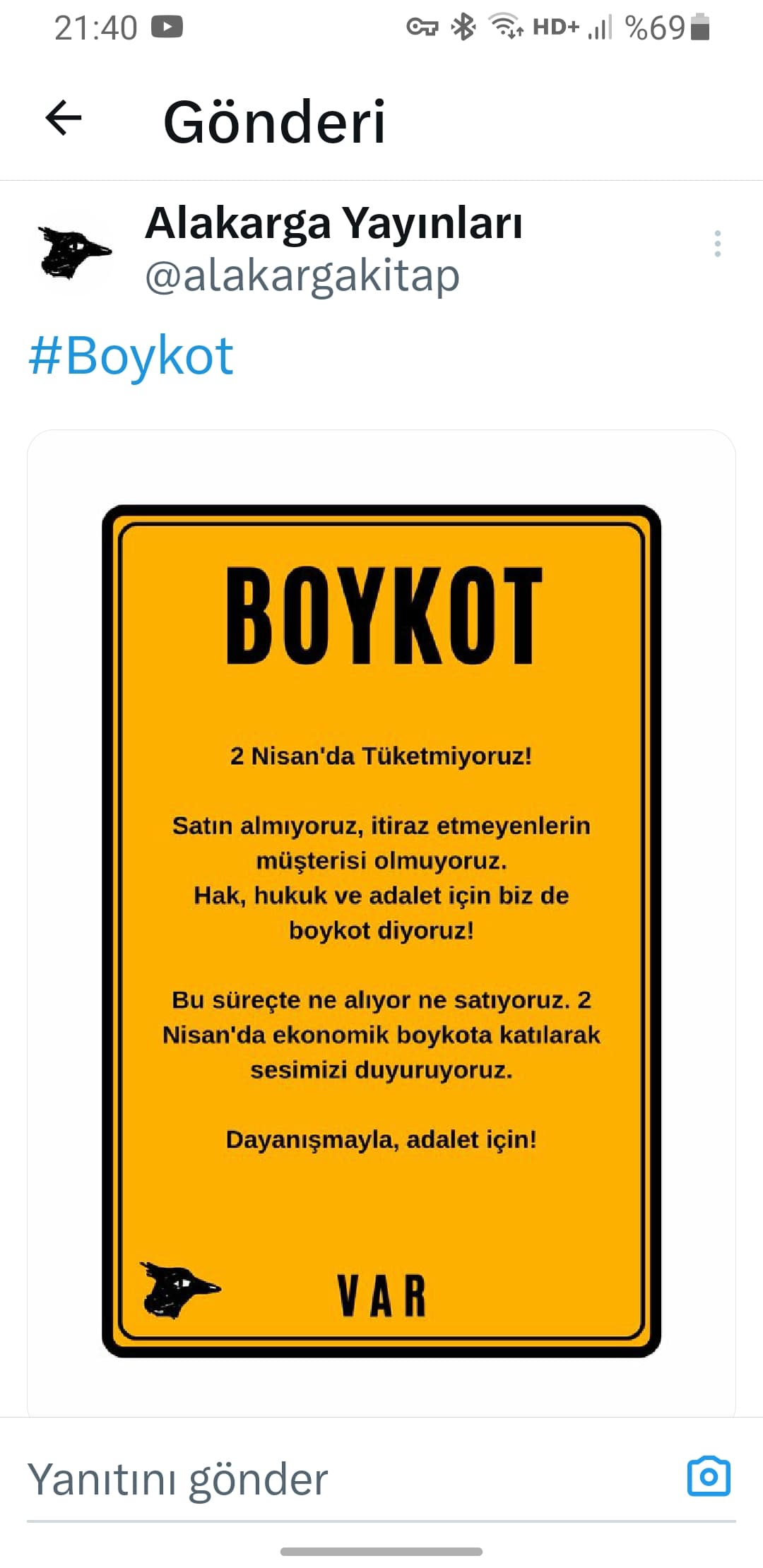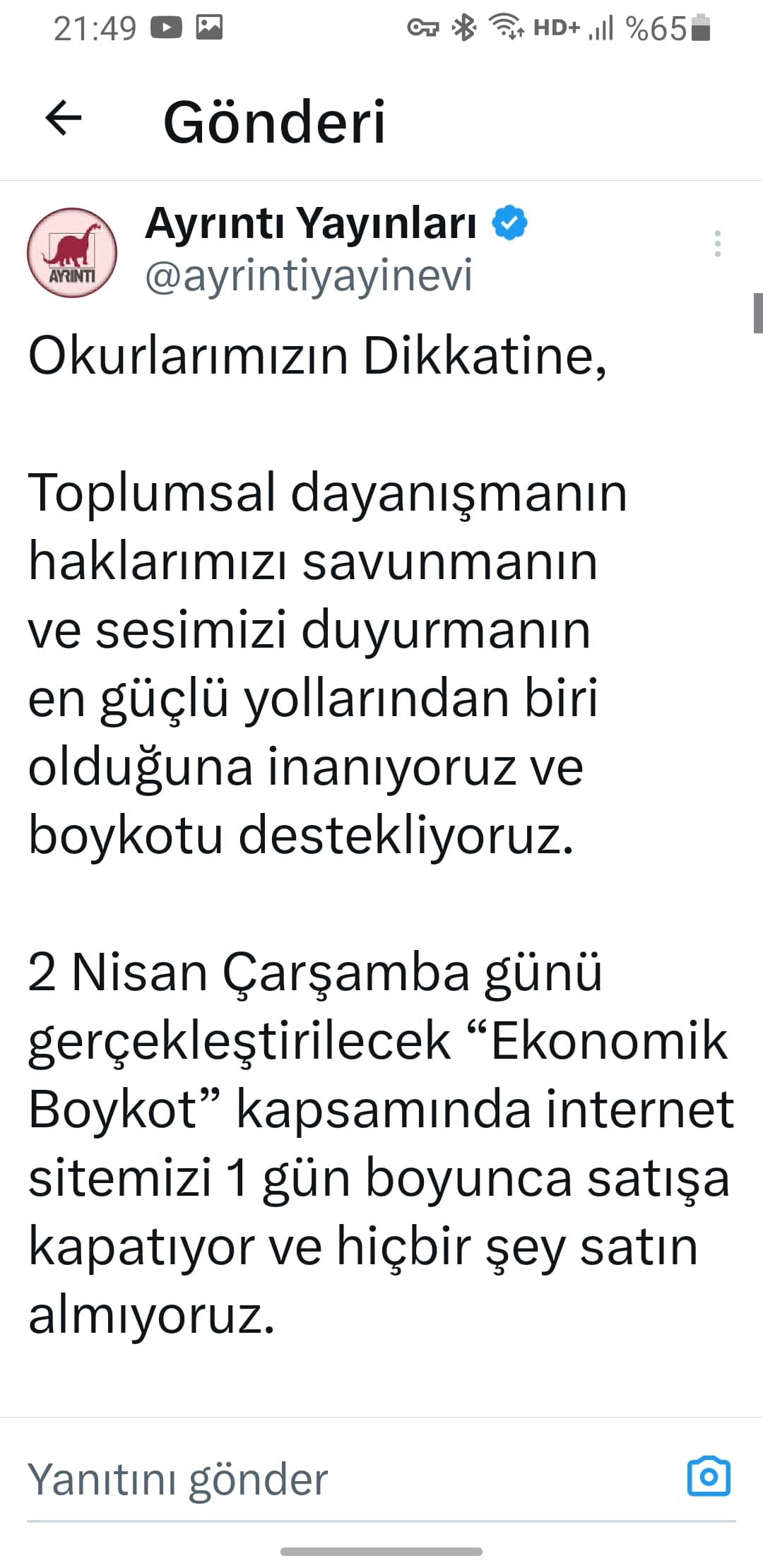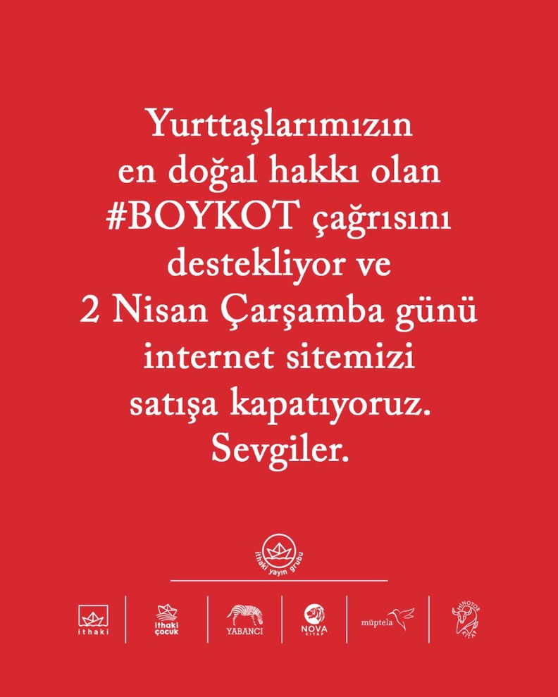 Dünkü #boykot post'umuz tarafımızca silinmedi. Paylaşımımız Türkiye'den erişime engellenmiş gözüküyor. Bu vesileyle halkın demokratik hakkı olan boykotu desteklediğimizi bir kere daha belirtiyoruz#2NisanBoykot #2nisantüketimboykotu https://t.co/BnAxReEHDG pic.twitter.com/PAWt4h7bfx