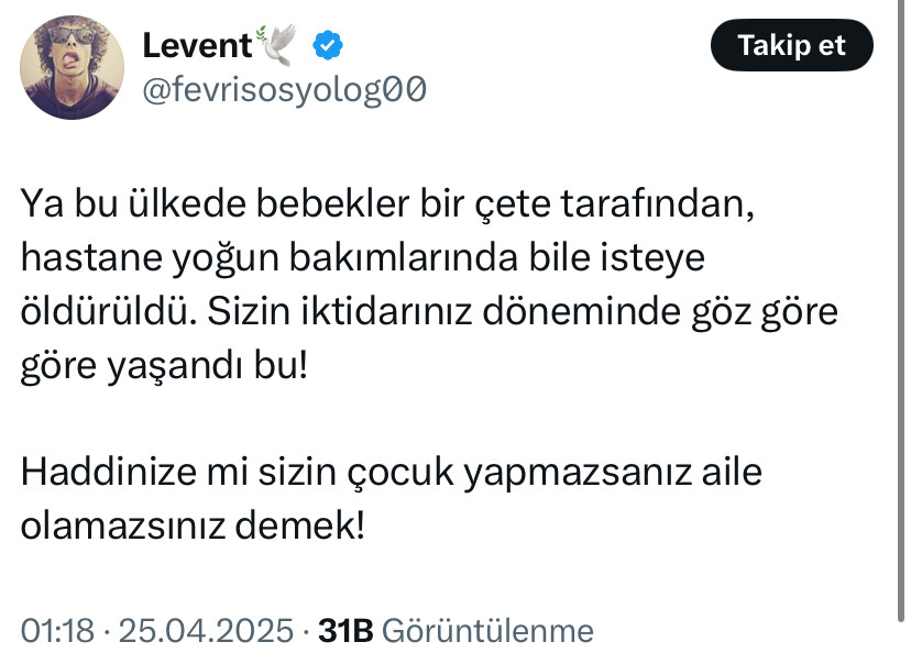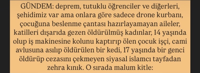 İğreniyorum bu zamandan: Her zerresi kokuşmuş, yozlaşmış, kafasız, yobaz toplumun bu kesiminden ve bu kesime hitap eden sistemden. Olan da bize oluyor. Bakın hiç takıyorlar mı gündemi? Kahvelerini içip üç maymunu oynuyorlar. Bunlar yüzünden başımıza gelmeyen kalmadı. Yazıklar olsun.