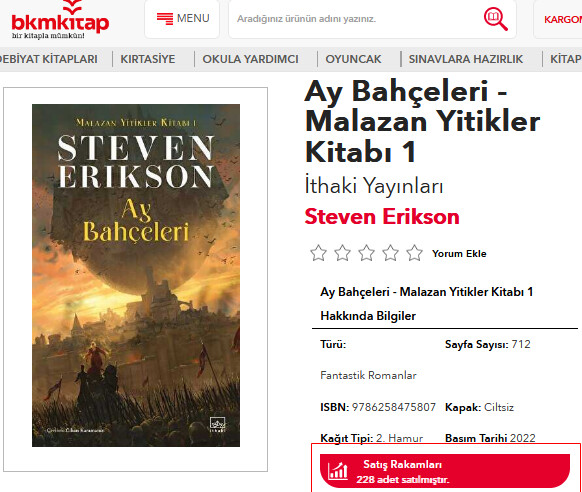 Şu anda forumdaki en popüler fantastik seri olan Malazan’ın hali ortada, Ay Bahçeleri yayımlandığı 29.01.2022 tarihinden beri Kitap Yurdu’nda 224 adet satılmış, o kadar kampanya, reklam ve neredeyse %50 indirimli satışlara rağmen.