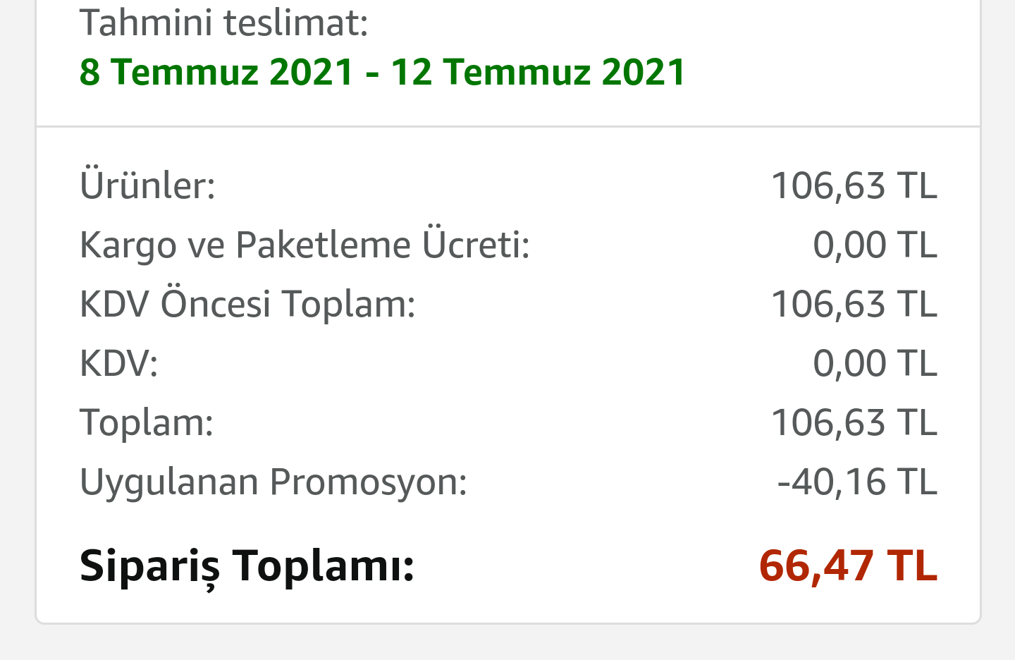 Amazon bazı ürünleri X, bazı ürünleri Y deposundan gönderiyor. İlk alışveriş olmamasına rağmen çalıştı kodum. Hangi ürünün olacağını bulmak gerekiyor. Tamamla deyince 1/2 1/1 teslimat yazısı çıkıyorsa o zaman geçerli olmuyor kod.