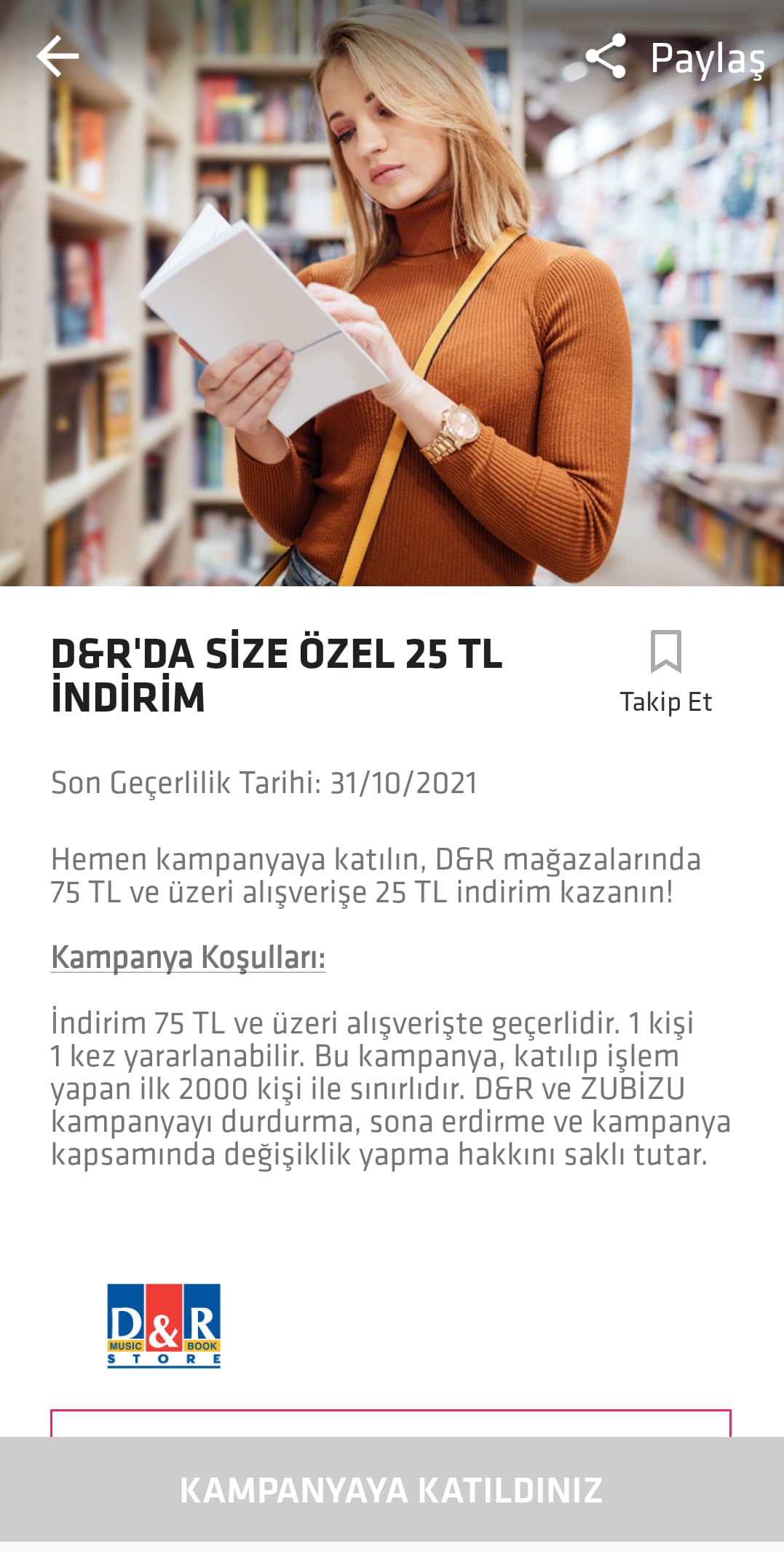 Bugün iş çıkışı gelen mesaj üzerine bir de yorgunluk atmak için D&R yolunu tuttum. Sözde 75/25 gibi bir kupon olduğu yazıyordu. Ancak içeri girdiğim andan itibaren fiyatlar o kadar yüksekti ki -ya da biz kupon ve indirim takip ederek çok uygun fiyatlara alıştık- elime aldığım kitapları geri bıraktım.