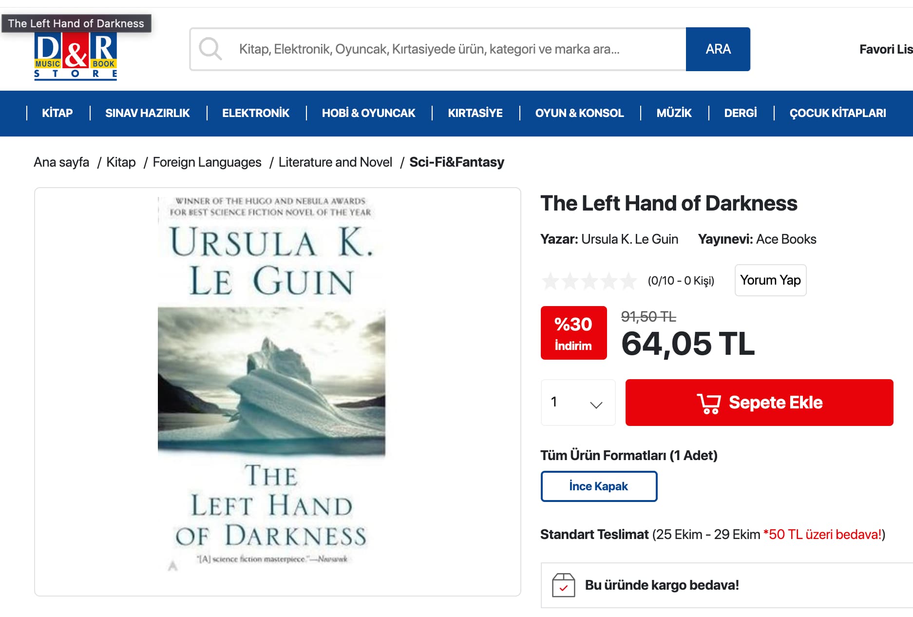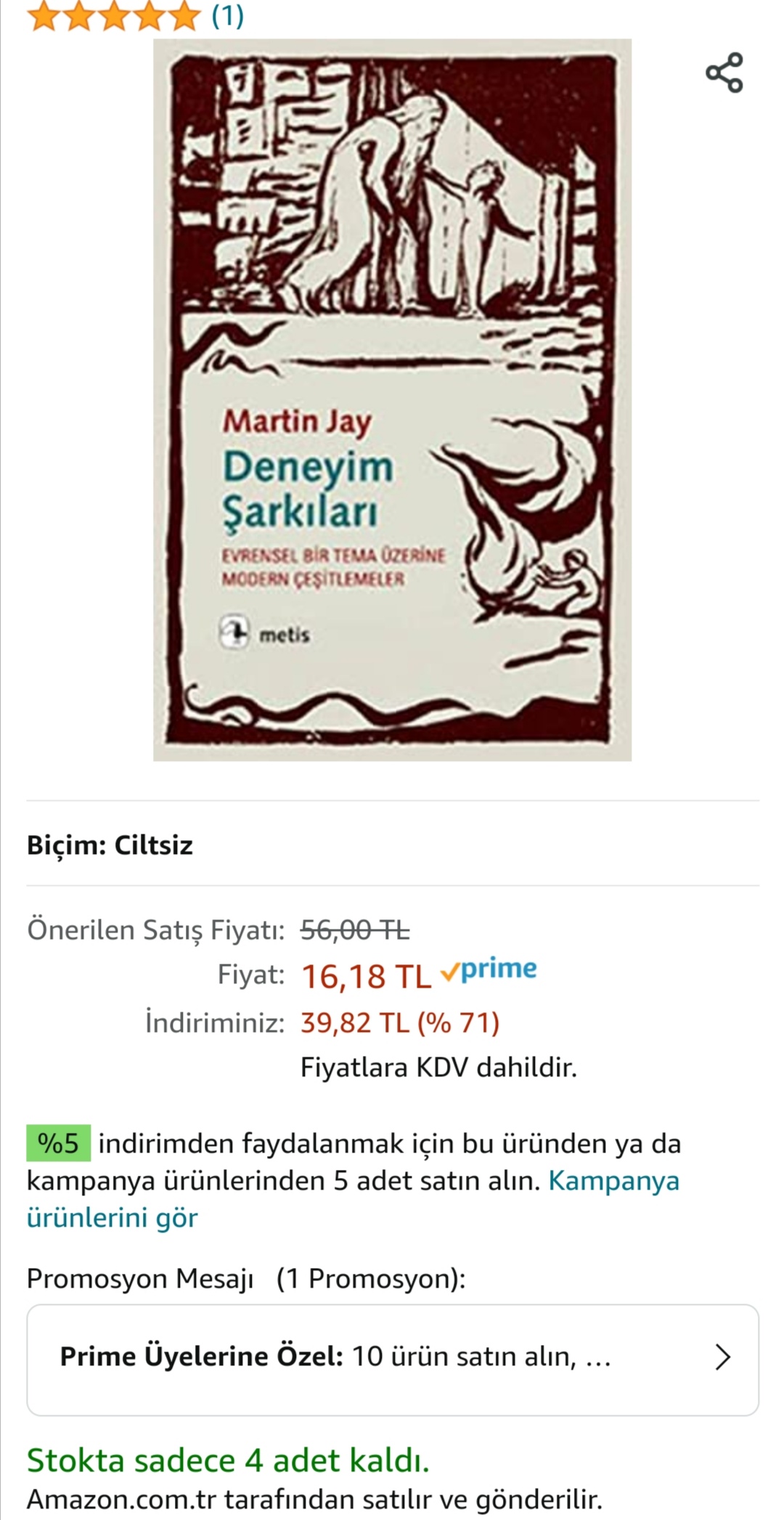 Yanına bir kitap eklerseniz otomatik olarak %5 indirim uyguluyor. Üstüne sepet kodu ile 50 TL’ye iniyor.