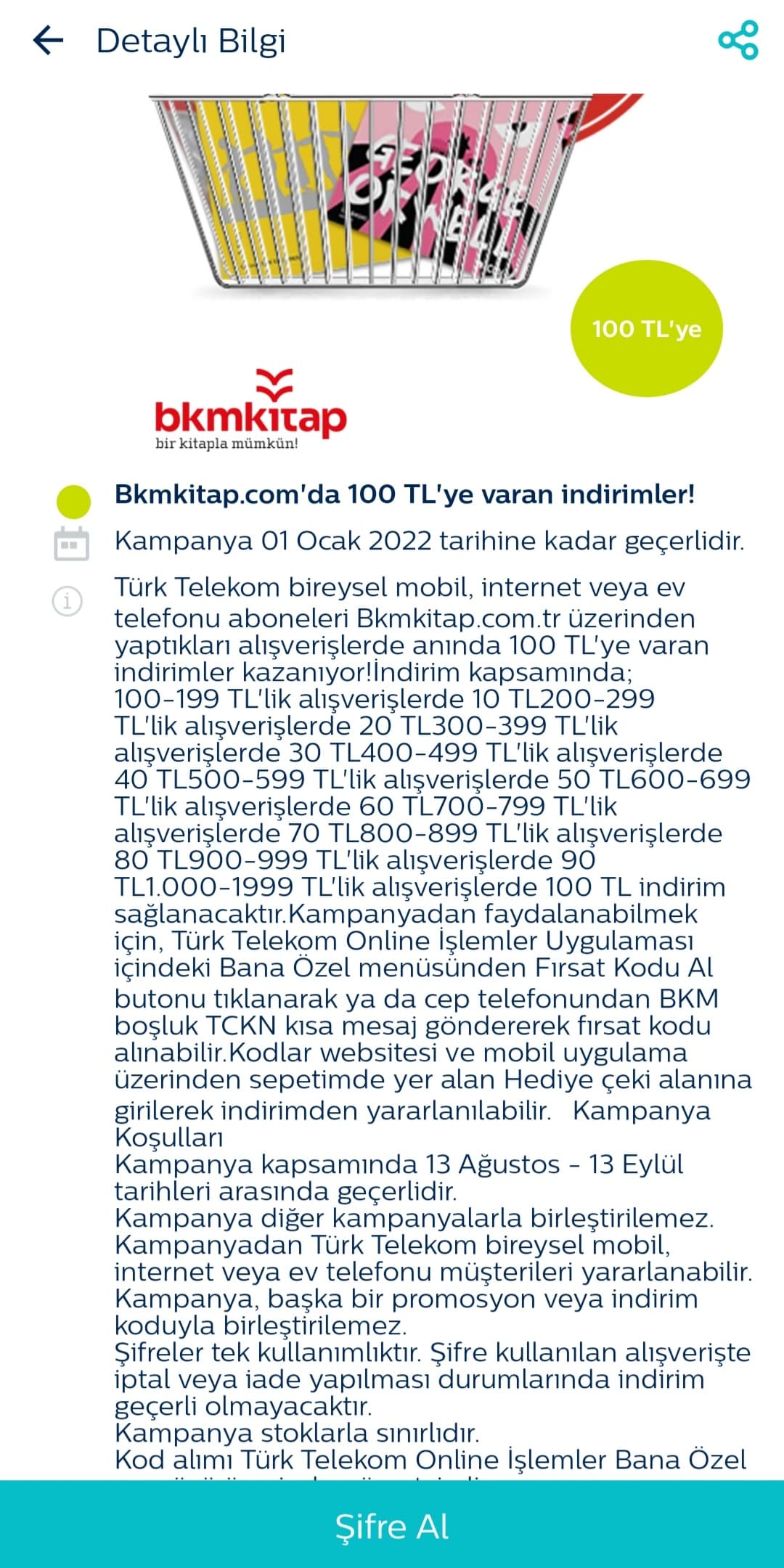 Türk Telekom Mobil uygulamadan alınıyor şifre. Katılım şartlarında 600 üzeri 60 gözüküyor. 30 lira kendi indirimi BKM’nin. Kodu girip sonraki sayfaya geçince altta görmen lazım indirimi.