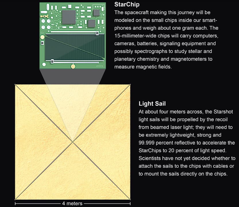 StarChip’e 16 metrakarelik aşırı hafif bir uzay yelkeni takılacak ve bu gemicik Dünya’dan ateşlenen lazerlerle (Motie’lerin light sail probe’una da laser canon’larla ilk ivme verilmişti) 0,2c gibi bir süratle 30 yıl içinde Alpha Centauri’ye ulaşacak. Mühendislik problemleri yeterince sağlam ve hafif bir uzay yelkeni üretmek ve 100 GW’lik bir lazer array’ini bu kadar ufak bir yelkene nasıl odaklayacakları sorununu çözmek.