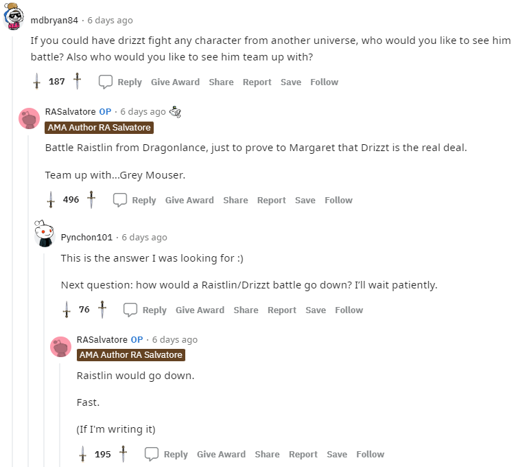6 gün önceki R. A. Salvatore Ask Me Anything’inden.