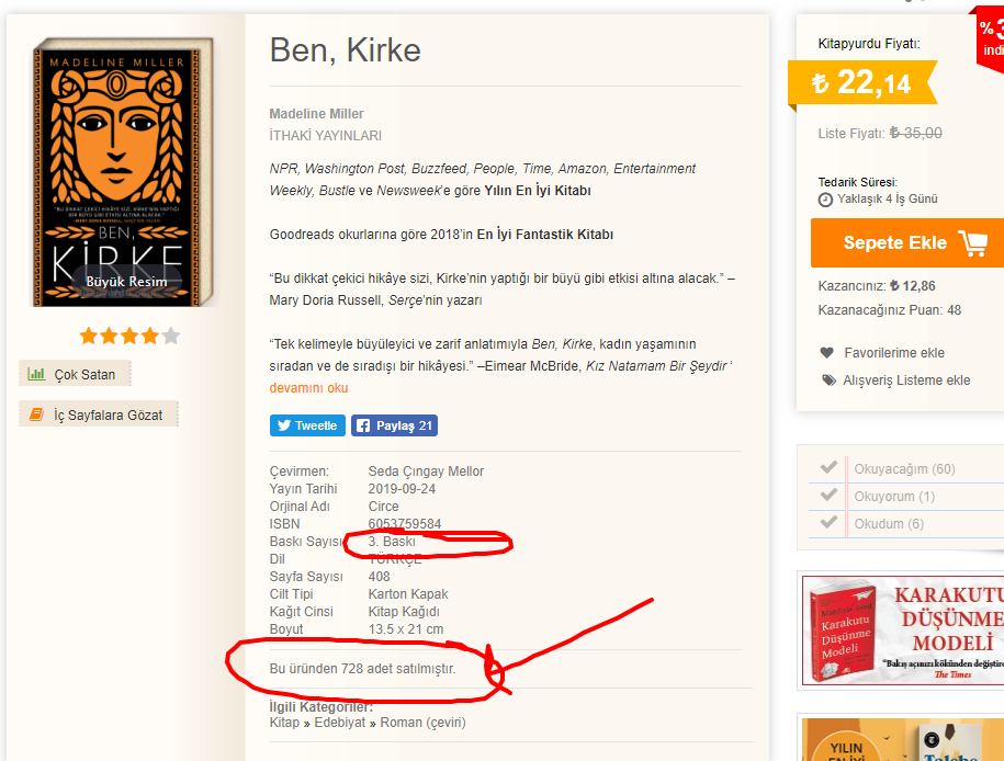 )şu an okuduğu kitap olarak Kirke’yi gösterip üzerine yorum da yapınca (bence) özellikle kadın okurlar arasında satışları patladı.