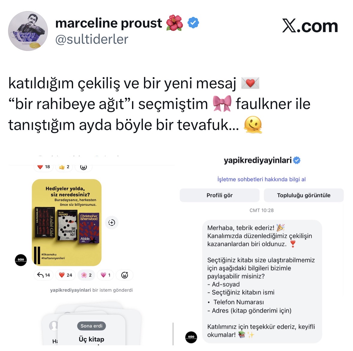 Yapı Kredi Yayınlar’nın “YKY Güncel” kanalında ara sıra kitap çekilişleri düzenleniyor, ikinci kez katılmıştım ve kazandım. Güzel etkinlikleri de paylaşıyorlar aynı zamanda. ![]()