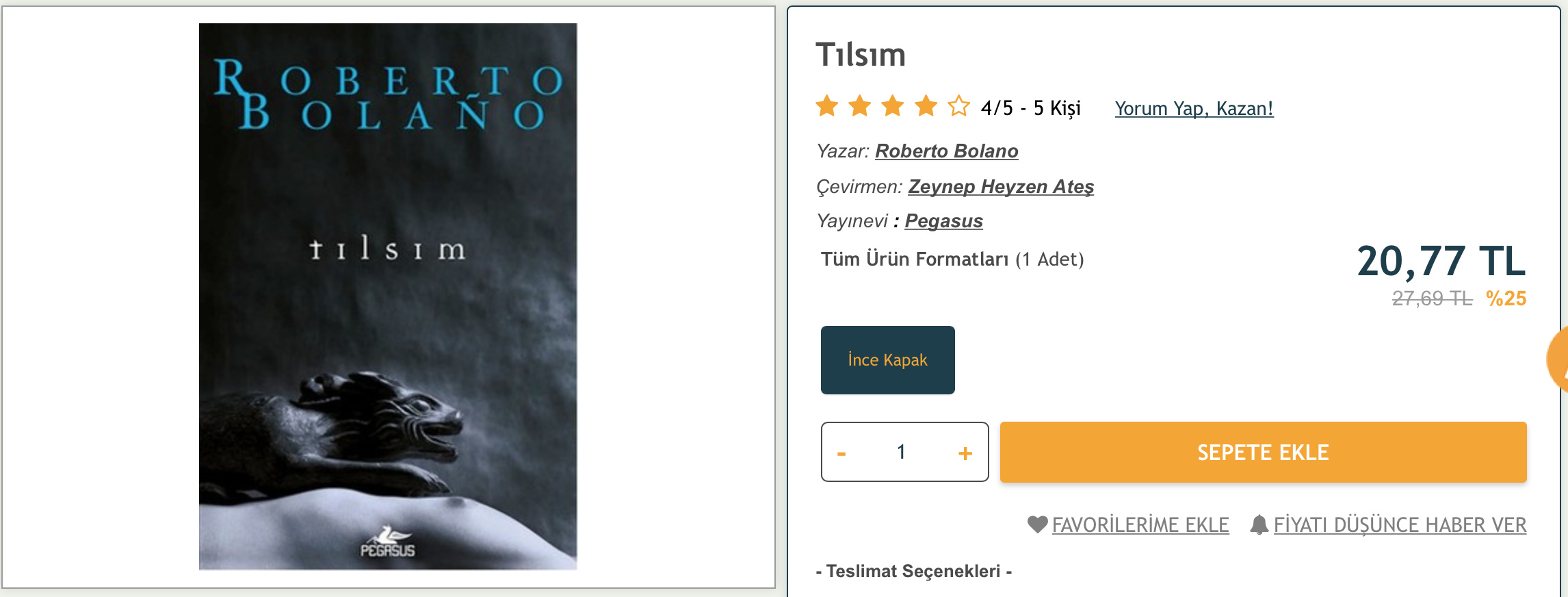 Pegasus’un fiyat politikası malesef böyle. Okuyucunun “Napalım, el mahkum alıyoruz işte” zihniyeti devam ettiği sürecede bu durum değişmeyecek. O yüzden ben yaklaşık 1 senedir (Tüfek Mikrop Çelik’nin fiyatlandırma rezaletinden sonra) Pegasus yayınlarının kitaplarını hep ikinci el alıyorum ya da %50 indirime girip olması gereken fiyata düşmesini bekliyorum. Misal Tılsım Pegasus’un N11 hesabında 13TL. ( Pegasusyayinlari Tılsım Fiyatları ve Özellikleri ) %50 indirim falan değil bu, olması gereken fiyat alsında. Üstü okuyucuya atılan kazık…