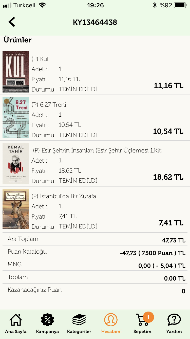 Harika alışveriş. Böyle puanla veyahut indirim kuponlarıyla düşük fiyata alınan kitap alışverişinde yakalanan his çok farklı, çok güzel oluyor bence. Eşim benimle bu hissi paylaşmıyor ama o ayrı