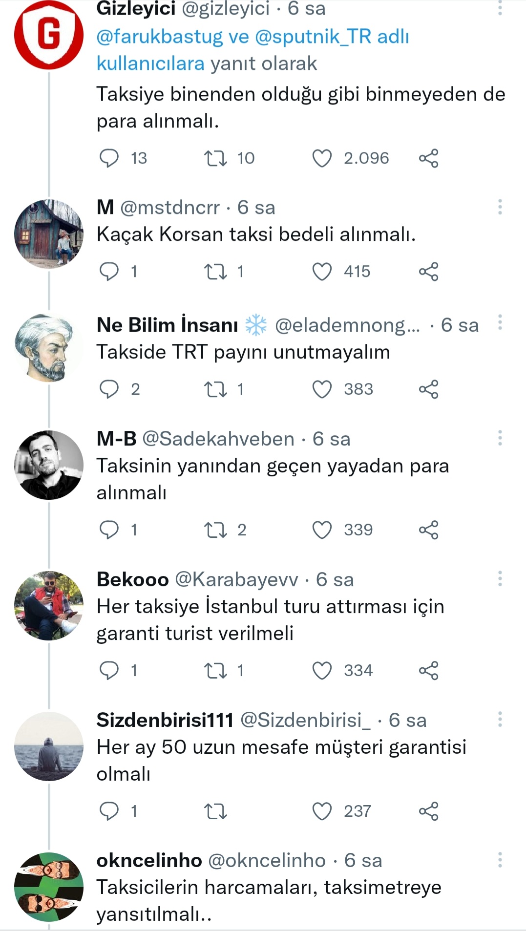 Taksiye binen müşteri gideceği mesafenin benzinini almalı ve kısa mesafe 50 TL, açılış 30 TL, taksimetre km başı %100 zam yapılmalı ve müşteri, şoförün canı ne zaman isterse o zaman götürmesini beklemeli.