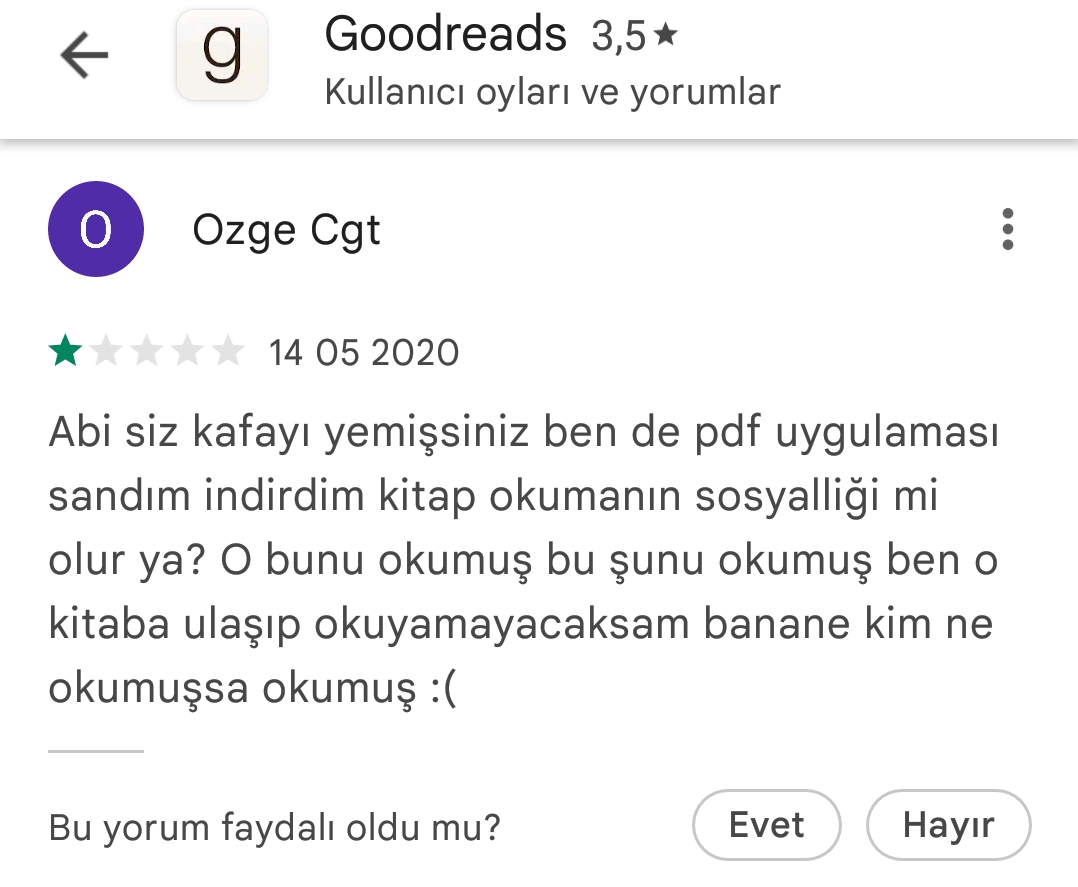 Goodreads’i de kitap okuma uygulaması sanıp 1 puan veren çok. “Kitabı açıp okuyamıyorum, bu nasıl uygulama” deyip kızıyorlar.