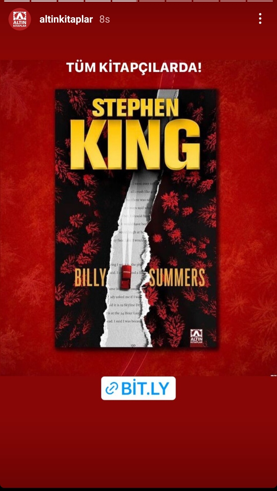 Ben de D&R’dan bekliyorum dün akşam sipariş ettim bugün kargoladılar çok hızlı, beklemiyordum. Ekim ayı gibi Poe Tüm Öyküleri İletişim Yayınları ikili seti sipariş ettim, 20 gün falan temin edemediler kızıp iptal etmiştim Gelsin de bayramda icapçı olmazsam sindire sindire okuyayım Billy’yi…
