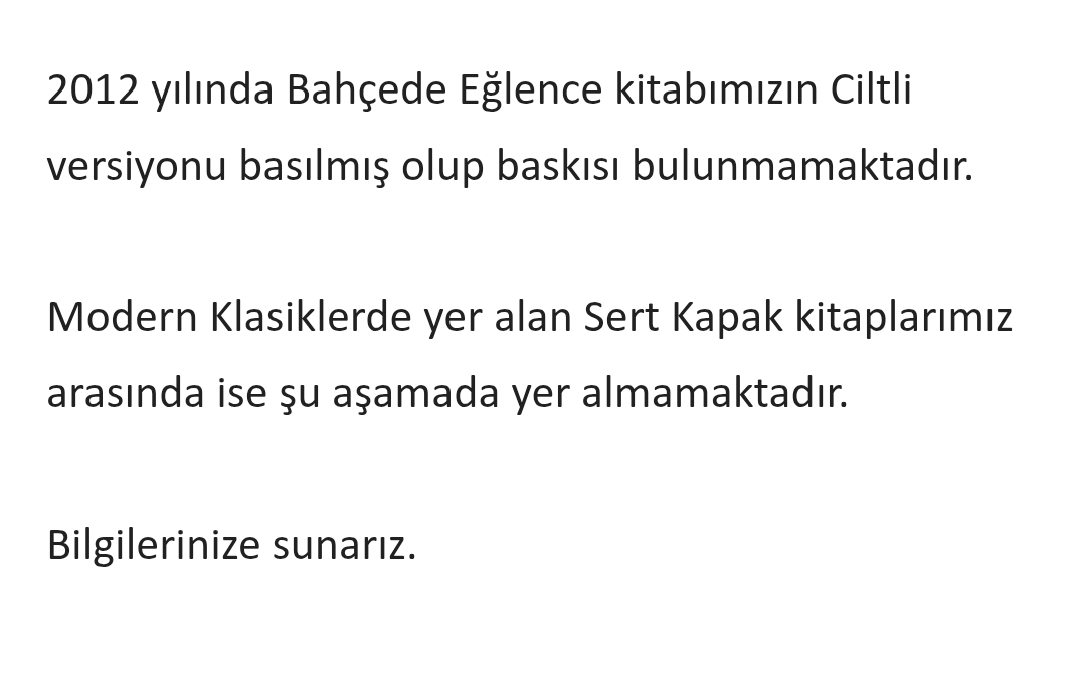 Gece gece kitaplarımla ilgilenirken aralarında “Bahçede Eğlence” kitabının ciltli versiyonunun olmadığını farkettim. Yıllar önce basılmış ve nasıl olduysa onu atlamışım. Hemen sitelere baktım ama hiçbir yerde yok malesef. Elinde fazla olan ya da nereden bulabileceğimi söyleyecek olan var mı acaba?