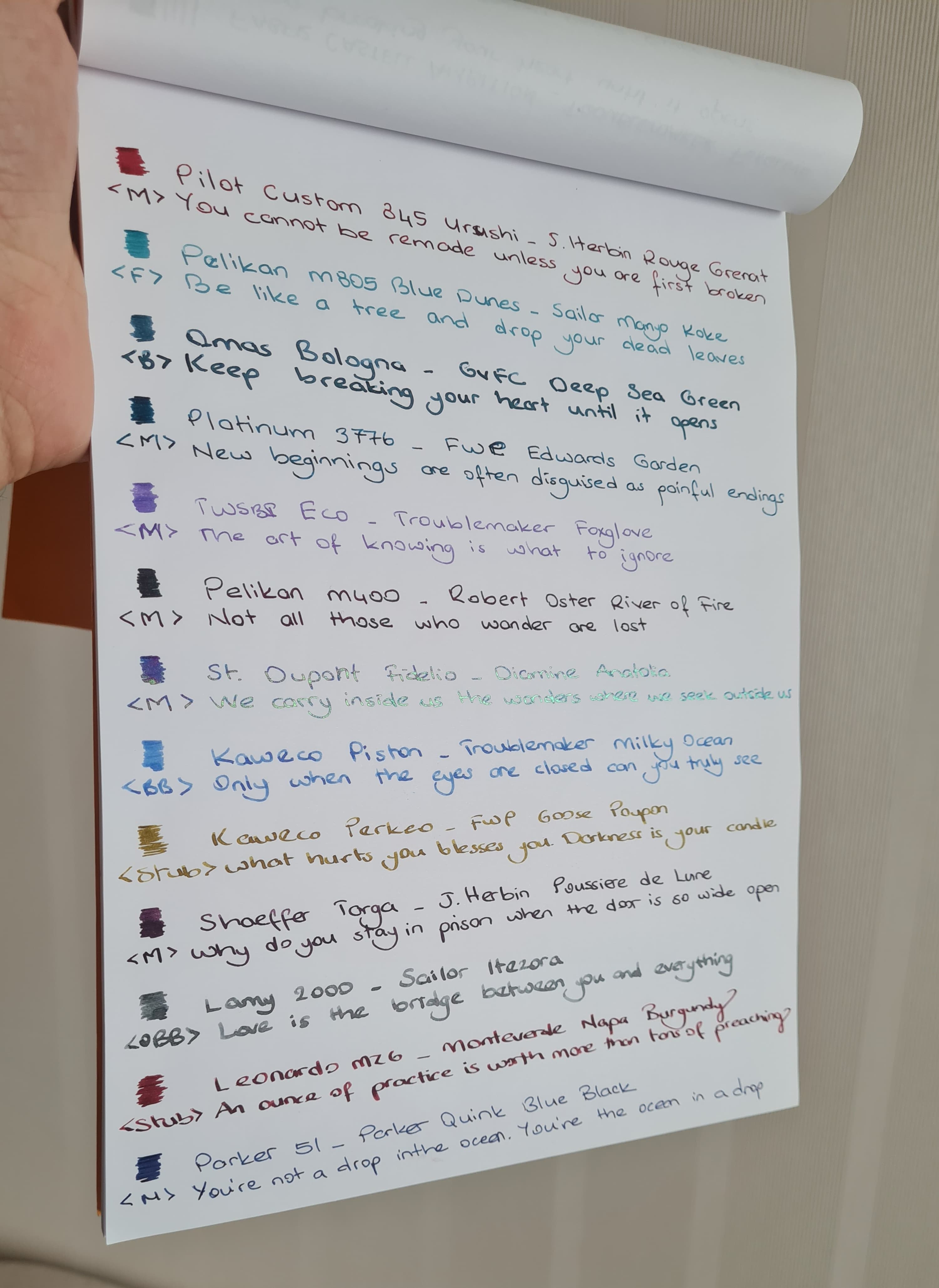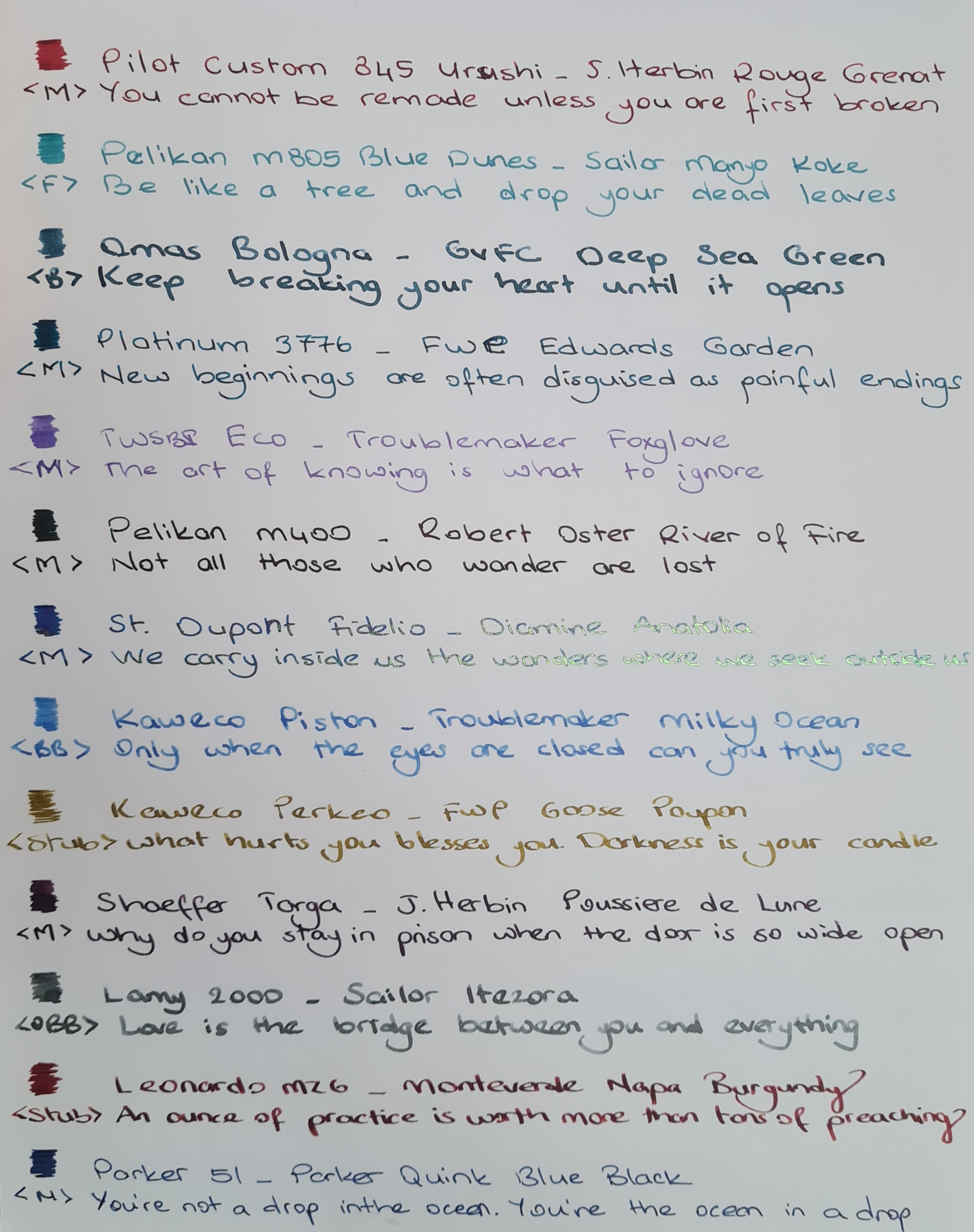Markanın İnkvent calendar serisinin revnaklı mürekkeplerinden bir tanesi. Bu tarz ultra revnaklı mürekkepler de diamine maalesef bir miktar hızlı kuruma yapıyor uçta. 1-2 gün bekleyen ince uçlu kalemlerde zor yazıyor. Bendeki M ama Japon olduğu için devamlı kuruyordu maalesef. Bu şişeyi elden çıkartabilirim zira bence bu renk tonlarını tükenmez kalemlerde bile görebiliyoruz. ![]()